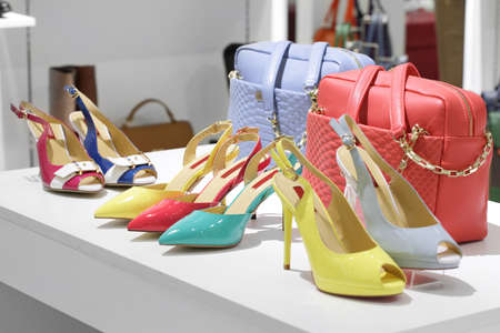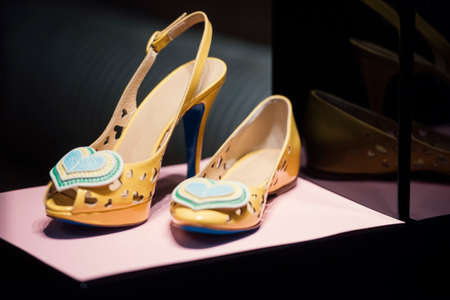 Classic high heel shoes with a red sale tag on a yellow background. Big Sale, discounts
