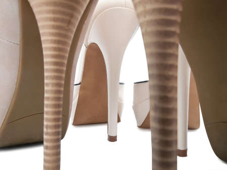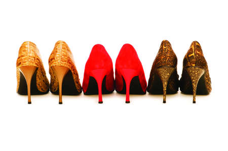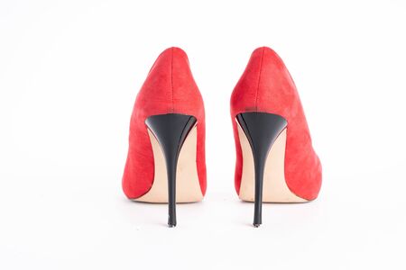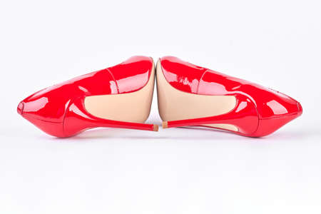 Woman beautiful red high heels. New classic shoes of red color with high heels on white background. Female elegance and sensuality.