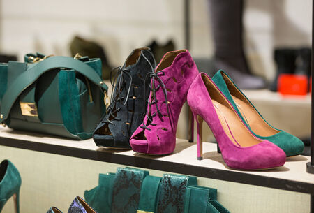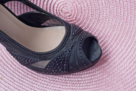 Kuala Lumpur, Malaysia - March 16, 2020: Malay Wedding, beautiful of dark grey high heels for the bride on the white cabinet, and pink background