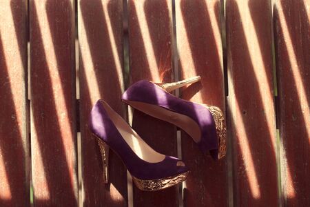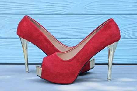 Women's shoes bright red suede on the wooden background.Women's shoes bright red suede on a wooden background.