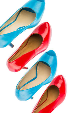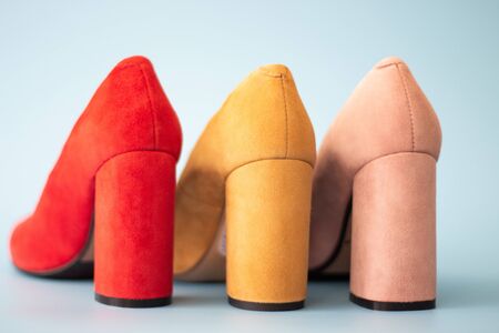 Woman high heel shoes on blue background toned. Fashion blog look. Top view, flat lay.