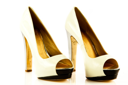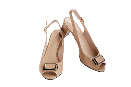 beige high-heeled shoes. Womens shoes with heels. A pair of beige patent leather womens shoes on a white background