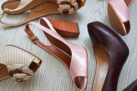 Beige women high heel shoes on pink background. Fashion blog look. Top view. View from above.