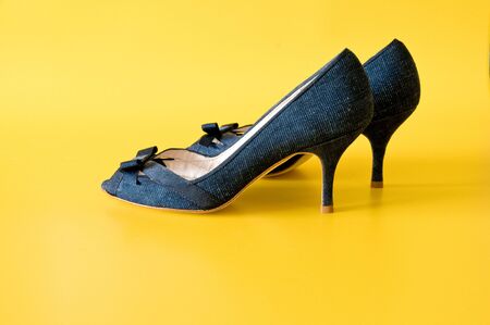 Women high-heeled shoes. A pair of beautiful blue shoes, back view.
