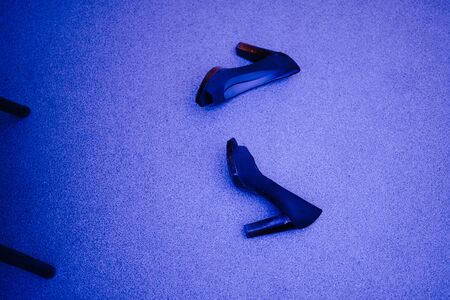 Black velvet shoes in neon light. Contrast bright background. Toned photo