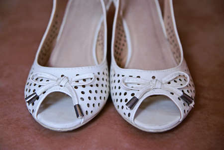 White high-heeled shoes with red soles. Elegant women's leather pumps on white background. Sexy wedding shoes. Concept of wedding celebration.