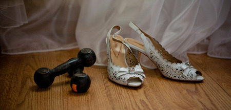 Female hands holding balck high-heel shoes over white dress. Cropped, no face.