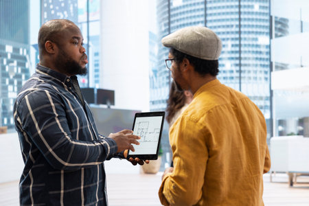 Real estate agent presenting a new office building to clients, discussing the detailed blueprints using a tablet during the property tour. Potential leasing investment opportunity.