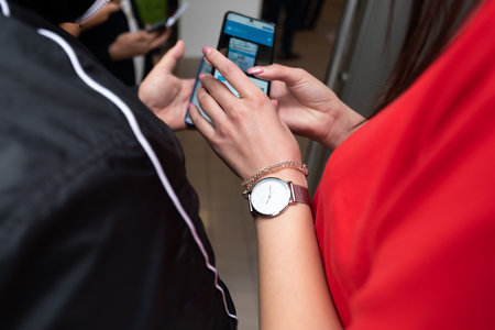 Close up of people using mobile smart phones - Detail of friends sharing photos on social media network with smartphone - Technology concept and cellphone culture with selective focus on right hand