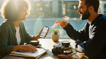 A group of friends enjoying coffee in a cafe, smiling and interacting, with a smartphone and camera on the table, plants in the background