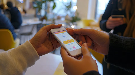 Individuals are checking their blood glucose levels using a smartphone in a cafe filled with customers while enjoying their time at work.