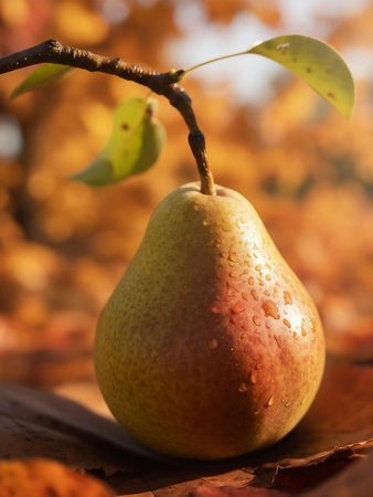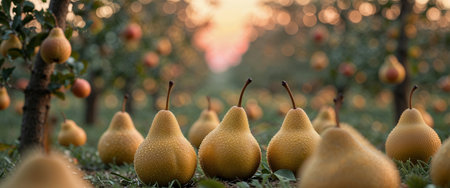 AI Generated. Golden Pears Glowing In Sunset Orchard Light