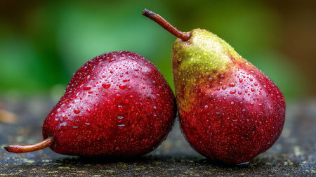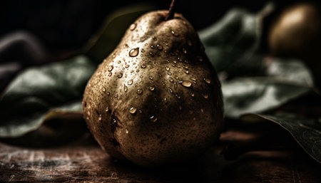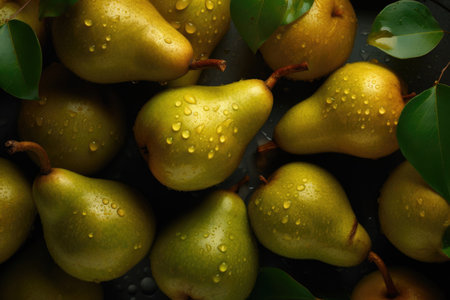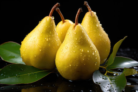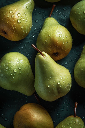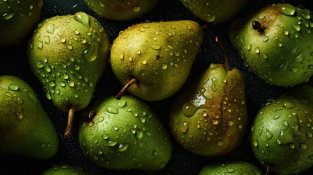 An AI generated illustration of juicy, ripe pears on a wooden tabletop, glistening with water droplets