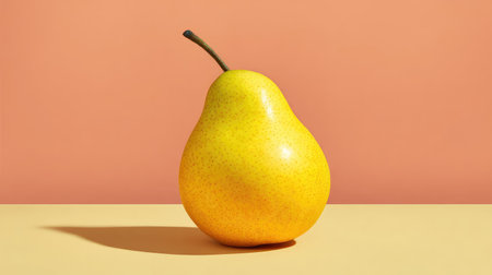 A vibrant yellow pear stands prominently on a minimal surface, showcasing its smooth texture and beautiful curves against a soft pastel background, perfect for healthy lifestyle visuals.