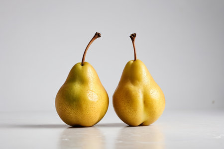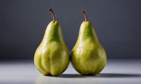Two green pears sit side-by-side on a white surface against a gray backdrop