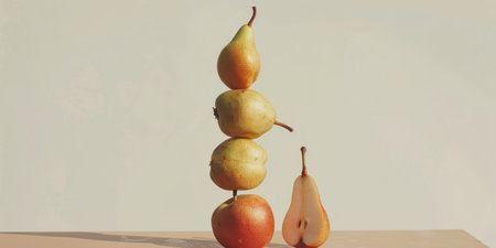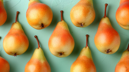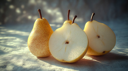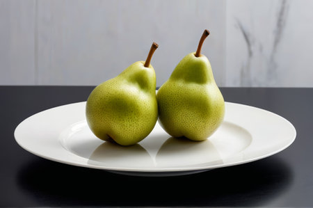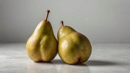 Fresh ripe pears rest on a gray surface illuminated by soft light, conveying a clean simple aesthetic Ideal for culinary and nutrition projects.