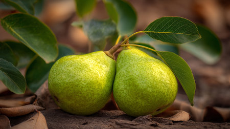 Cluster of ripe, speckled pears hanging from a tree branch, bathed in sunlight