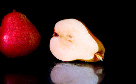 Red pear whole and half pear with water drops on black background, close-up, copy space, template,