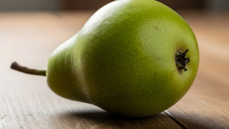 A fresh green pear rests on a textured wooden surface, captured in a close-up side view. The soft lighting highlights the fruit's smooth skin and organic shape, emphasizing natural freshness and healthy eating.