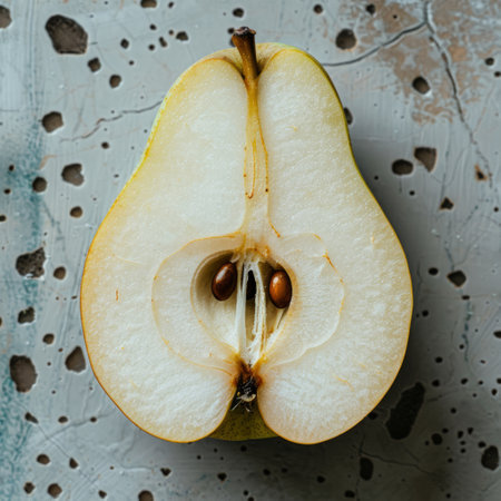 Fresh whole and cut pear on a white table with coriander seeds, creating a simple yet elegant composition