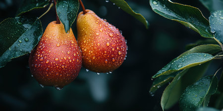 Two ripe pears are hanging from a branch, covered in raindrops, surrounded by rich green leaves. The soft lighting of late afternoon enhances the colors of the fruit and foliage.