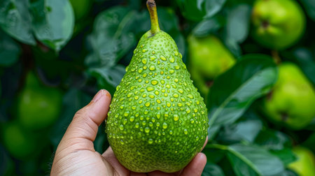 Fresh pear held in hand, selection of pears on blurred background with copy space