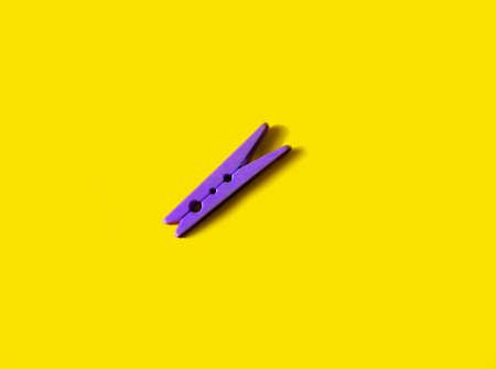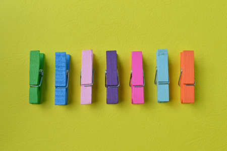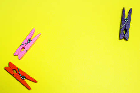 Decorative multicolored wooden clothespins on a yellow background. Flat lay composition