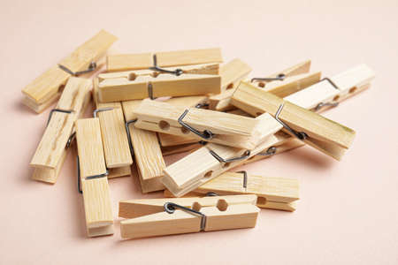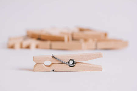 Wooden clothespins scattered on a white background. View from above. Copy space