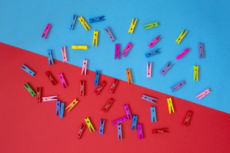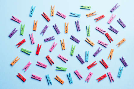 many colored clothespins on a blue background, as a substrate, pin clothes peg