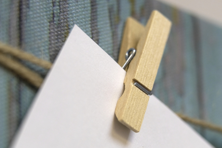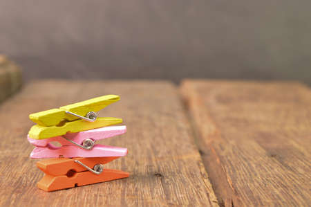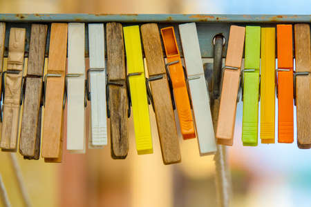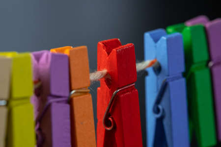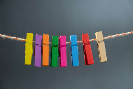 Concept colored wooden clothespins on a ropeclip wooden clothesline colorful. pink yellow.