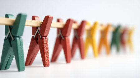 A close-up shot of colorful clothespins hanging on a wooden line, showcasing a vibrant array of hues and textures.