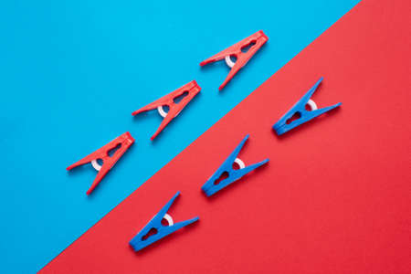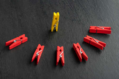 Stand out from the crowd and different concept. Leadership and other similar concepts. One red clothespin stands out from other yellow clothespins on blue background.