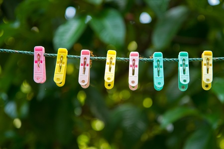 Colorful clothespins on a clothesline in the garden. Selective focus.