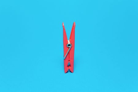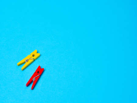 Yellow and red wood clothespins pegs on blue background and free space for text