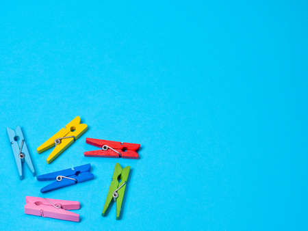 Colorful wood clothespins pegs on a blue background and free space for text. Yellow, blue, red, green and pink item. Different bright colors and positions