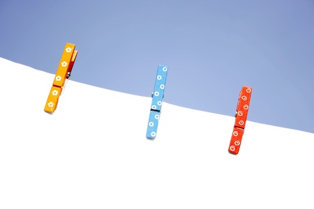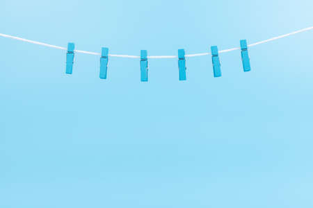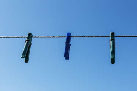 clothespins hanging on a rope. Three clothespins hang from a clothesline. Against the background of the blue sky.