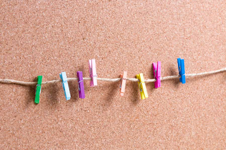 how many small multi-colored wooden paper clothespins on a paper rope against the background of a cork board for notes, copy space, mock up