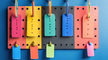 A vibrant arrangement of colorful blank label tags arranged on a colorful board, ideal for showcasing creativity, organization, and design inspiration.