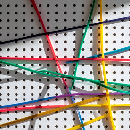 A vibrant web of colorful cords crisscrosses a white pegboard, representing the complex and often chaotic nature of modern networks, communication, and problem-solving.