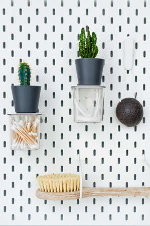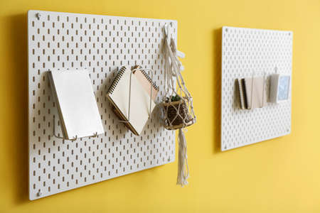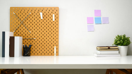 Creative workspace with a pegboard, books, sticky notes, and a potted plant.