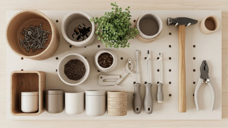 Well-organized pegboard displaying assortment of tools. Screws in wooden bowl. Coffee beans in ceramic cups. Hammer and screwdrivers neatly hung.