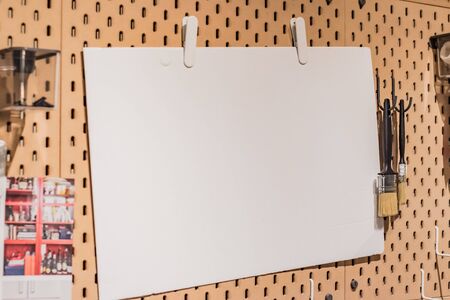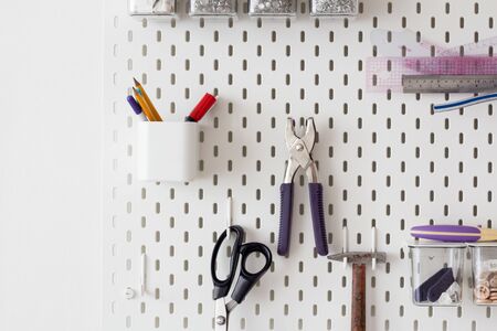 Pegboard with sewing supplies for tailor. White board for accessories storage. Sheets of clothing patterns, pincushion, threads, scissors, etc.