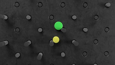 Colorful spheres against a geometric background with a wooden block and metal discs.