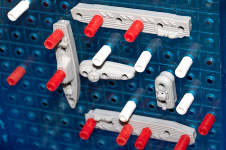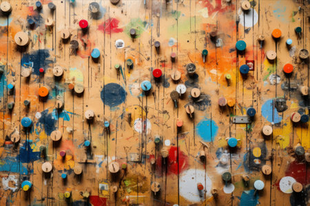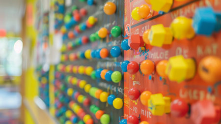 This image shows a close-up of a wooden peg board with circular pieces of different colors, arranged in a grid pattern. The pieces are all brightly colored, and some of them have small wooden pegs protruding from their centers. The board is made of wood and has a rustic texture.