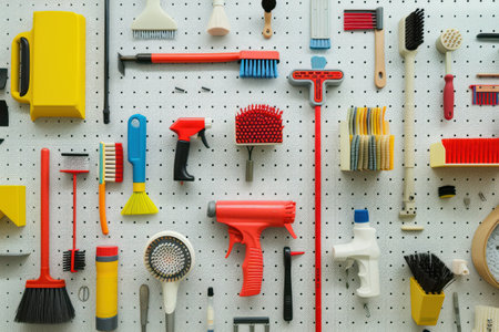 A conceptual photograph featuring cleaning tools arranged in a visually appealing pattern, emphasizing their colors and designs. --ar 3:2 --v 6 Job ID: 9a0ab724-fdc7-4d2b-8111-1f0244f43773