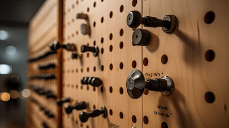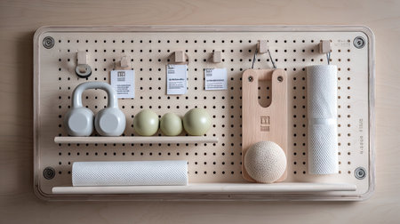 A stylish wooden pegboard showcases an array of fitness equipment, including kettlebells and foam rollers, designed for a modern workout space.