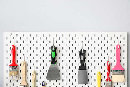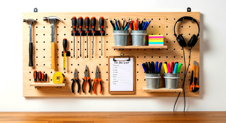 a pegboard organizer displaying a variety of tools, stationery, and headphones mounted on a white wall. This image features a transparent background, making it versatile for various design projects.