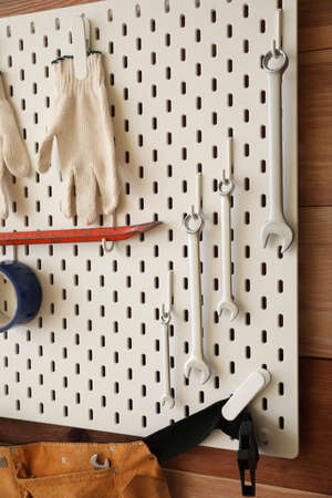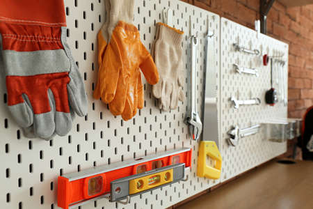 Girl is choosing tools on the table and board. Glue, tape measure, steel ruler, screwdriver, wrench, scotch tape, yarn, scissors, hammer, cutter, orderly hanging, ready to use. Workshop scene concept