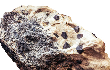 kyanite mineral with garnets on the white background