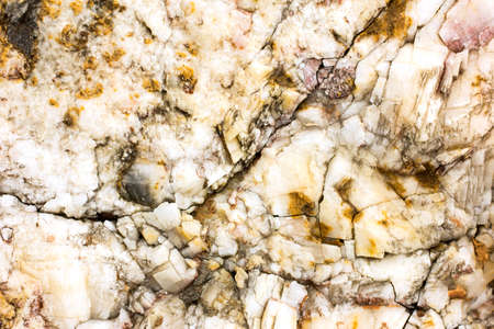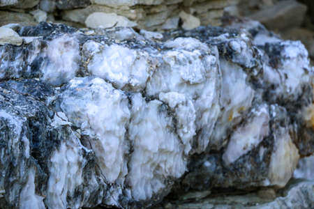 Diverse colored quartz rock in cut of earth. Deposits of gray, white, orange quartz. Untreated semi-precious stones of the chalcedony variety in various stone deposits and layers of different rocks.